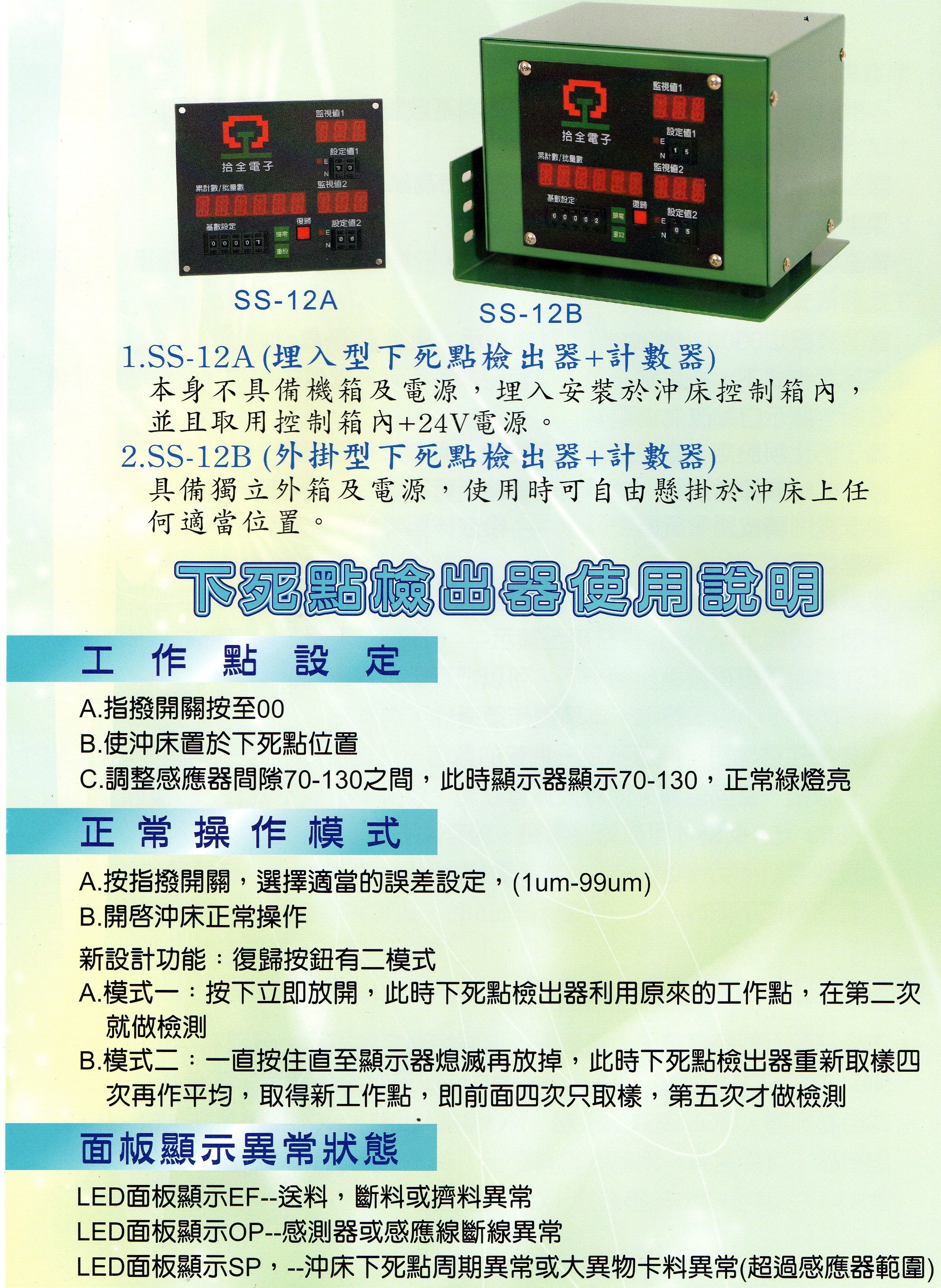 1 . SS-12A(埋入型下死點檢出器+計數器) 埋入安裝於沖床控制箱內 2 . SS-12B(外掛型下死點檢出器+計數器) 外掛於適當位置